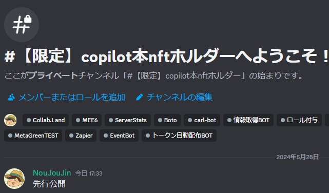 このNFTをお持ちの方限定で、Discordサーバー内に『Copilotがよくわかる本』の専用チャンネルを設置しています。本書のおすすめのパートを厳選して、発売前に先行公開いたします!